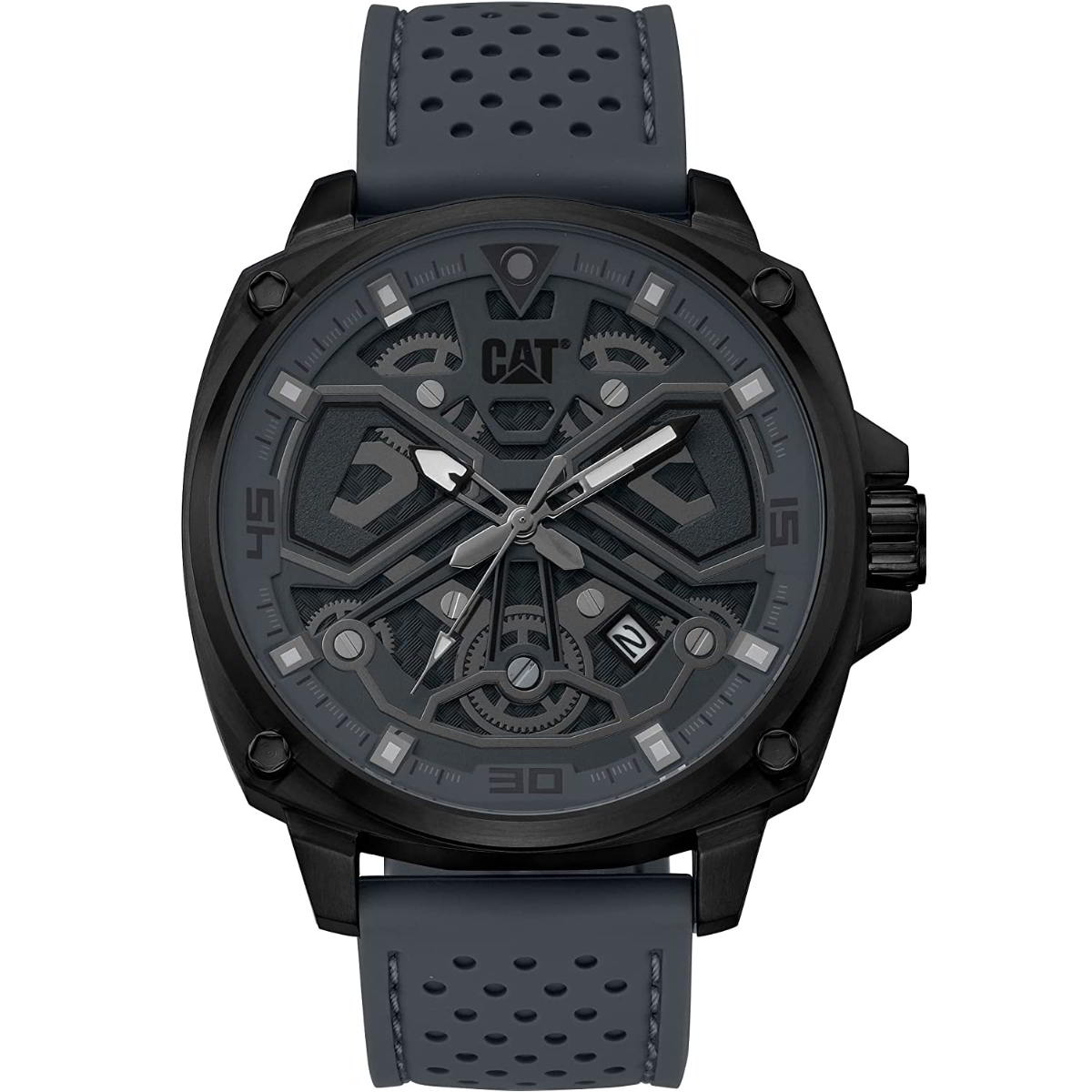 ساعت مچی مردانه کاترپیلار مدل AJ.151.25.525 با طراحی مدرن و اسکلتون، جلوهای خاص و منحصربهفرد دارد. قاب مشکی رنگ از استیل ضدزنگ ساخته شده و همراه با بند سیلیکونی سوراخدار طوسی، راحتی و دوام بالایی را برای استفاده روزمره فراهم میکند. صفحه اسکلتون مشکی با عقربههای شبنما و نمایشگر تاریخ، علاوه بر ظاهر خاص، کارایی بالایی نیز دارد. این ساعت با موتور کوارتز ژاپنی عمل میکند و تا عمق 100 متر در برابر آب مقاوم است.