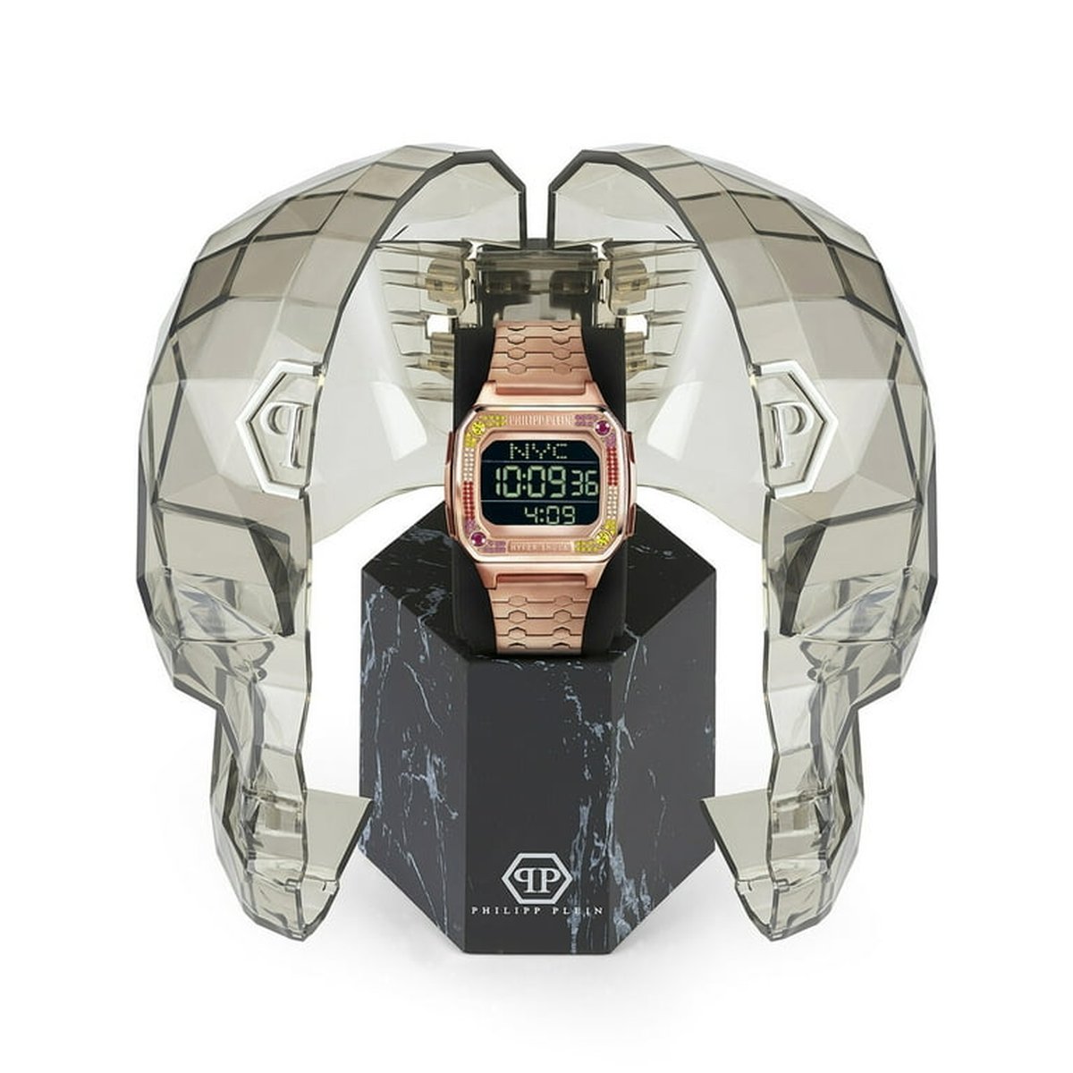 ساعت Philipp Plein مدل PWAAA1221 با قاب استیل آبکاریشده طلایی و بند سیلیکونی سفید، ترکیبی از لوکس بودن و استایل مدرن را ارائه میدهد. صفحه طلایی مزین به جمجمه کریستالی، جلوهای خاص و متمایز به این مدل بخشیده است. این ساعت با موتور کوارتز دقیق، شیشه مینرال مقاوم و مقاومت در برابر آب تا عمق ۵۰ متر، انتخابی جسورانه برای دوستداران طراحی منحصربهفرد برند Philipp Plein است.