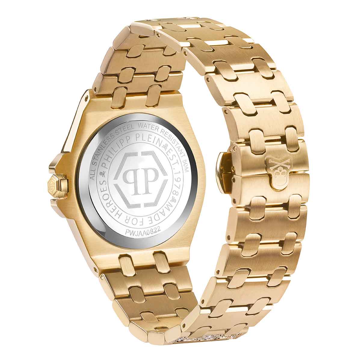 ساعت Philipp Plein PWJAA0822 نمادی از شکوه و استایل مدرن زنانه است. ترکیب رنگ طلایی براق با کریستالهای درخشان، جلوهای مجلل و چشمگیر ایجاد کرده که برای استایلهای مجلسی و لوکس کاملاً مناسب است. طراحی لانهزنبوری در صفحه و لوگوی خاص فیلیپ پلین، امضای جسورانهی برند را در این مدل به نمایش میگذارد.